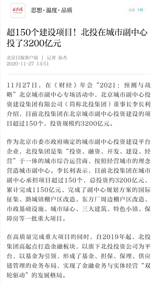 目前,北投集團在城市副中心承擔項目超過150個,總投資約3200億元,完成了副中心規劃方案的國際征集、潞城鎮棚戶區改造、東方廠周邊棚戶區改造、市政基礎設施、城市綠心、三大建筑、特色小鎮、保障房等一批重大項目。