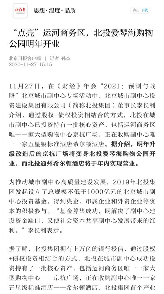 “十四五”時期,北投集團將進一步貫徹落實黨的十九屆五中全會精神和習近平總書記在北京考察時的重要講話精神,全面貫徹新發展理念,全力推動城市副中心高質量建設發展,為將城市副中心打造成為國際一流的和諧宜居之都示范區、新型城鎮化示范區、京津冀區域協同發展示范區,助力通州區繁榮發展,作出新的更大貢獻。