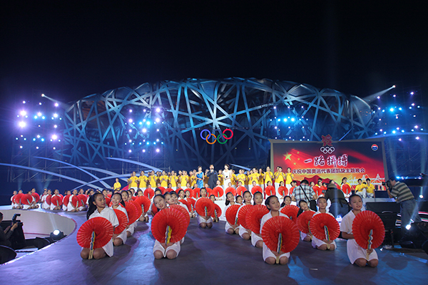 由國家體育總局和北京市政府主辦,北京電視臺承辦的“一路拼搏——慶祝中國奧運代表團凱旋主題晚會”于2012年9月3日晚在北京奧林匹公園中心區慶典廣場舉行。初秋的慶典廣場星光璀璨、明星云集,剛剛在第30屆倫敦夏季奧運會上載譽而歸的林丹、易思玲、曹緣、陳一冰、張成龍、趙云蕾, 陳定、鄒市明、雷聲、李娜、蔡赟、傅海峰、張楠等13名奧運冠軍集體亮相,不僅現場用精彩的才藝表演展現了奧運冠軍的多才多藝,還講述了他們拼搏背后的成長故事,表達了對祖國和人民的感激之情。同時,成龍、譚晶、戴玉強、莫華倫、羽泉、朗朗、胡彥斌、齊秦、薩頂頂、李宇春、林妙可等演藝界明星鼎力助陣,用精彩的文藝演出為奧運冠軍慶功。